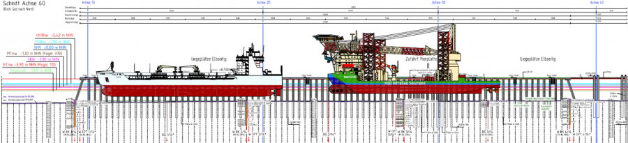 Errichtung Kaianlage für Schwerlast unter Tideeinfluss, rd. 17 m freie Wandhöhe, rd. 600 m lange Schwerlastpier, Bodenertüchtigung, Flächenbefestigung, Hafenausrüstung